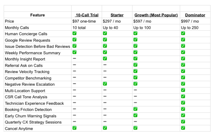 We personally call your customers to ask how their experience was. Warm hospitality-grade outreach that builds trust. And — if positive — request a Google review.
